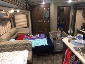 Since we were lucky enough to find this camper that still had four bunks with floor space, sleeping arrangements are easy. We have a foam mattress topper from our old camper that fits perfectly on the floor. And two of these bunks are actual twin beds, not the smaller camper twins! A big kid and little one can easily sleep together on one if they have to. We also put the littlest one in a pack-n-play because he has not reached trustworthy status. So rather than worry that he is up walking around and getting into things, he is caged. 🙂 And during the day, we roll the foam topper up and put it on a bunk so that the pack-n-play can go in the back bedroom with the door closed for nap time. It really is too good to be true!