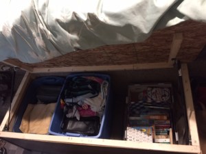 There is a large storage compartment under our master bed, bigger than our last one. I experimented and found I could fit tubs in it so I was able to use this for extra towels, swim gear, and books! I’m a homeschool mom, books are required wherever we go! (I love to purchase Sonlight’s summer readers. They have selections for girls and boys and are split by grade level. I buy a few packages and leave them out, and inevitably they get gobbled up over the summer.)