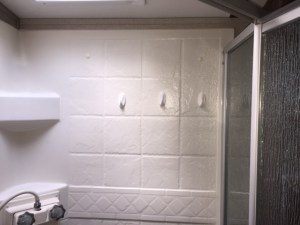 Another time saver in this camper is the “teens can get ready” space in the bedroom. I found some stick on mirrors at Walmart and placed them in the cubby meant for a tv. With the cabinets and extra counter, they are able to store all their toiletries, straighteners, and curling irons. Anything that doesn’t require a sink they do! Life saver!