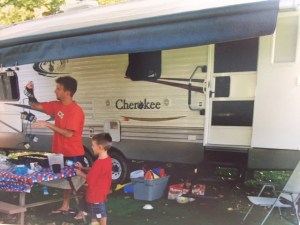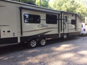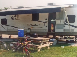 We bought our first camper in 2007. It was an old green and white hard side Wilderness.  It had a front dinette that turned into a bed, a small kitchen, four bunks in the middle and a small bathroom in the back. We thought it was the greatest thing we’d ever seen! We took that monster on several trips, even as far as Kentucky! We quickly fell in love with the pack-as-much-as-possible-and-close-the-door model that a hard side camper afforded compared to a pop-up. There was no going back.