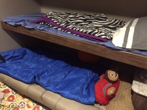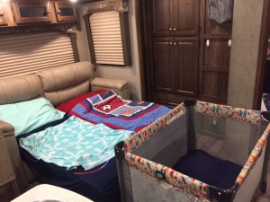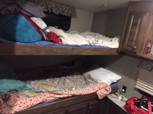 Since we were lucky enough to find this camper that still had four bunks with floor space, sleeping arrangements are easy. We have a foam mattress topper from our old camper that fits perfectly on the floor. And two of these bunks are actual twin beds, not the smaller camper twins! A big kid and little one can easily sleep together on one if they have to. We also put the littlest one in a pack-n-play because he has not reached trustworthy status. So rather than worry that he is up walking around and getting into things, he is caged. 🙂 And during the day, we roll the foam topper up and put it on a bunk so that the pack-n-play can go in the back bedroom with the door closed for nap time. It really is too good to be true!
